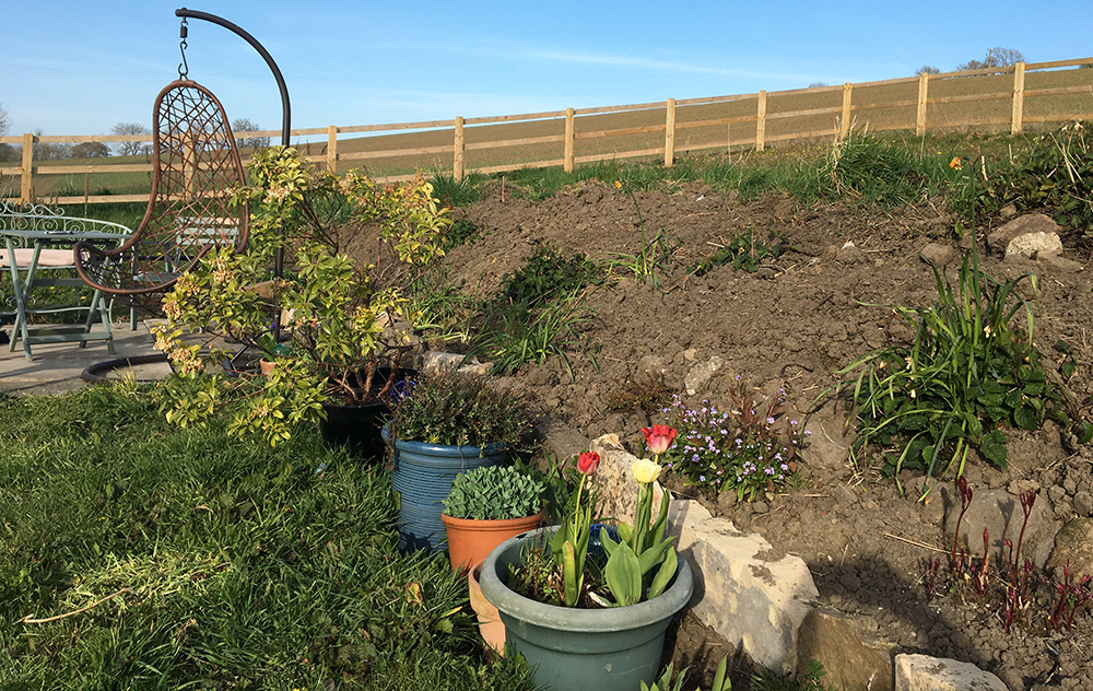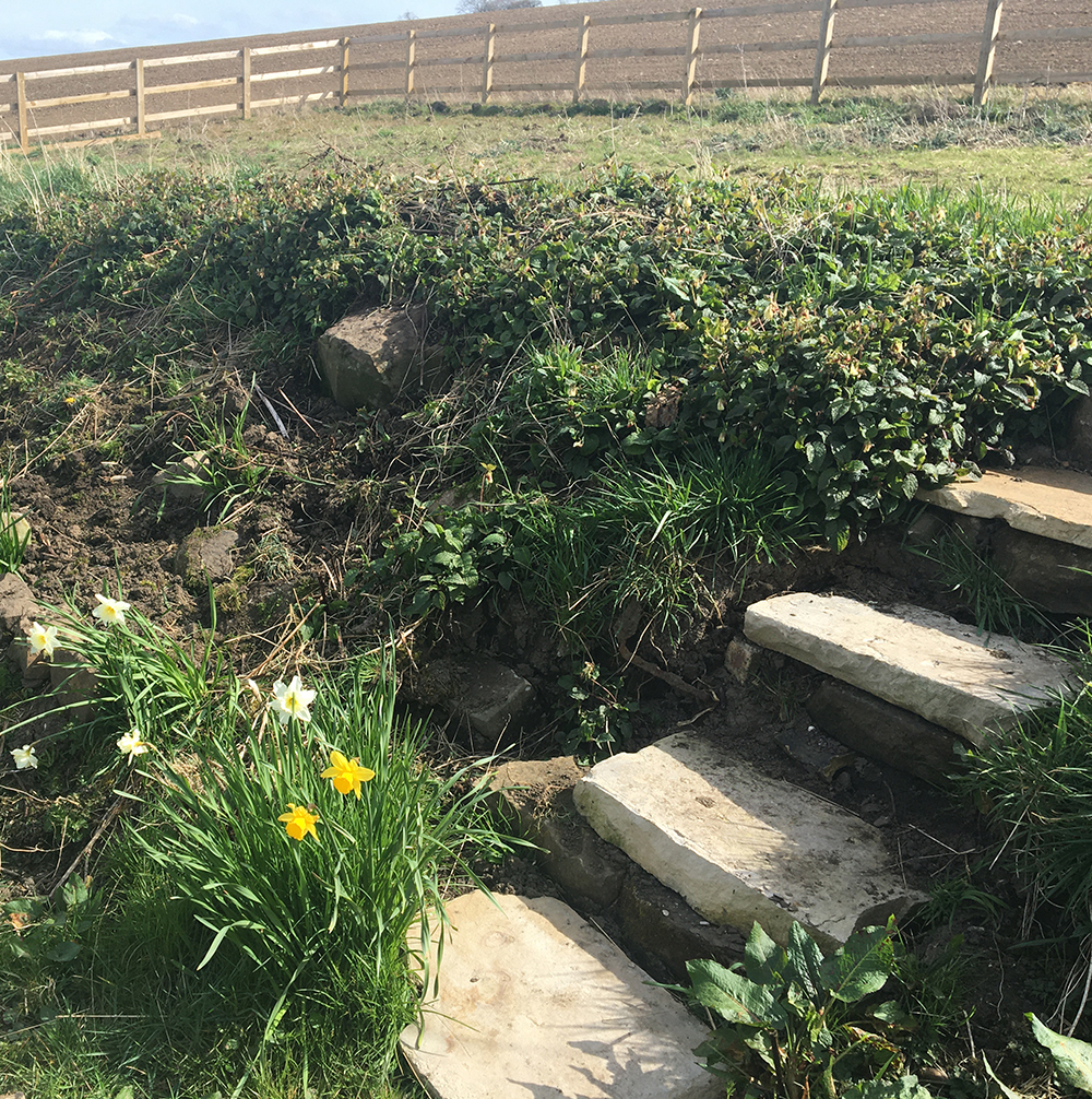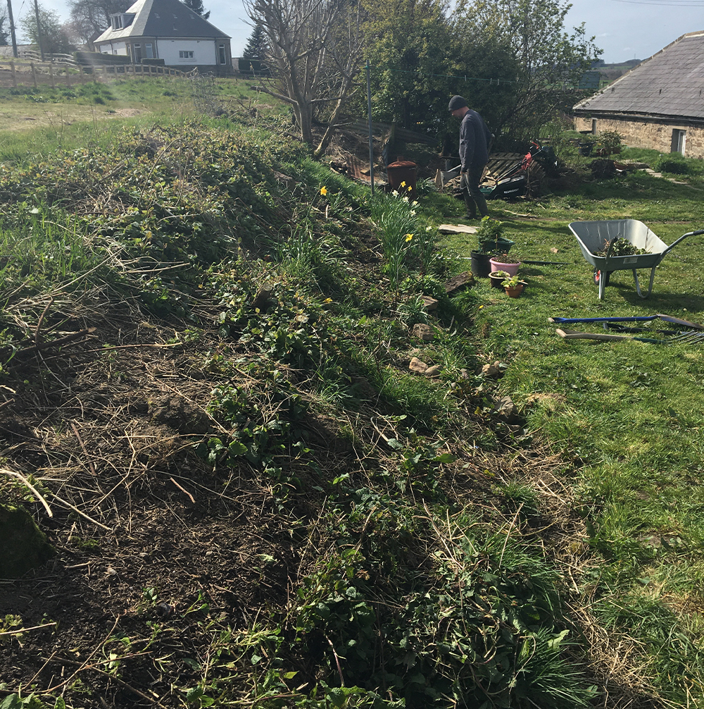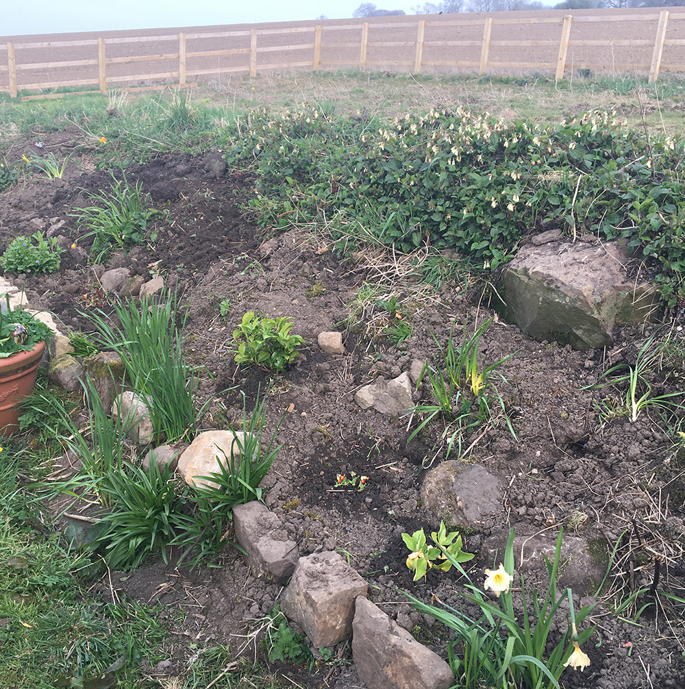 After mowing and general maintenance to try and keep the weeds under control we thought we’d start by doing something with the ridge… when we bought the house the higher bit of land was part of the field behind, there wasn’t a wall or anything, just a nettle and weed covered ridge. So we decided to make a flower bed.