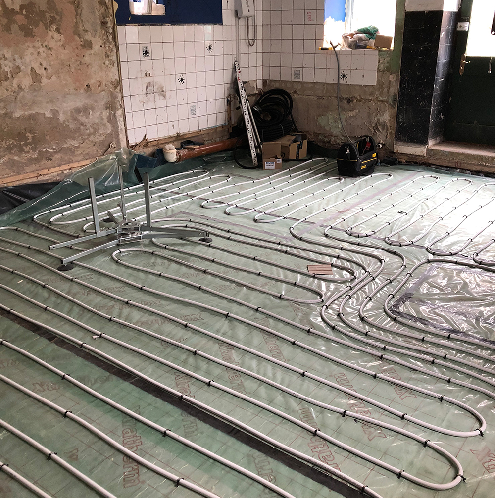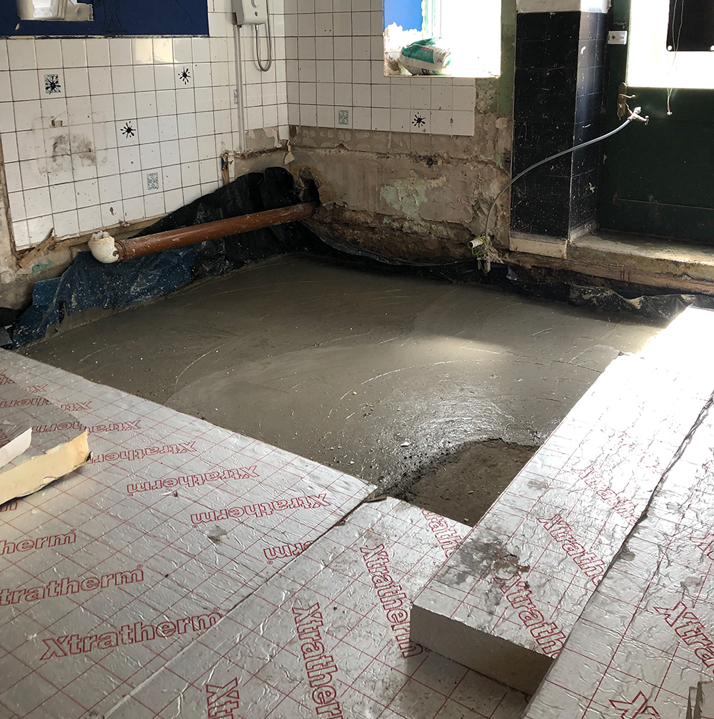 The last bit of concrete was hand poured in the bathroom area, the insulation went down and all the underfloor heating pipes laid ready for the screed.